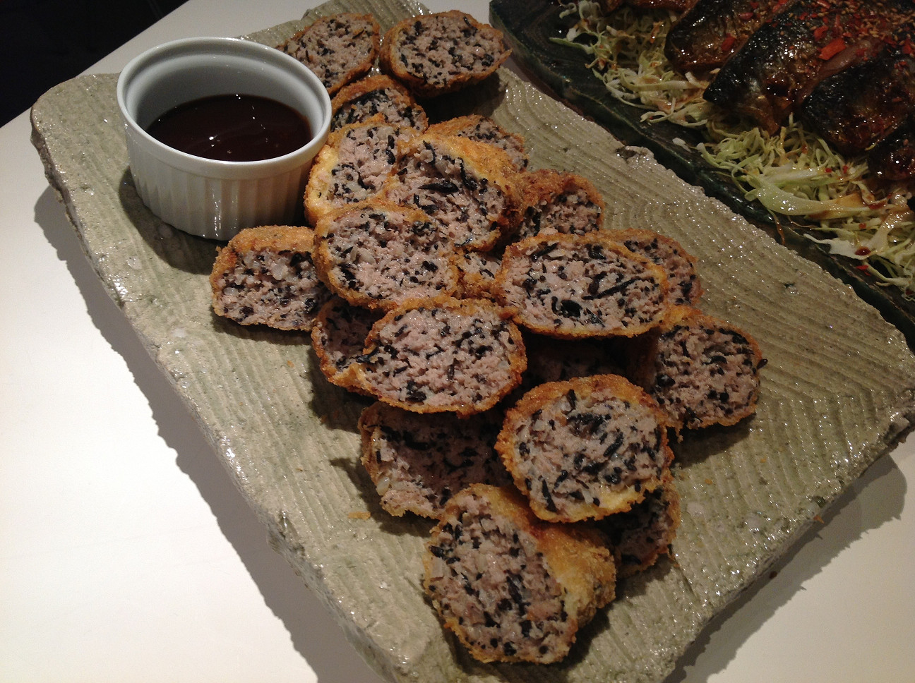 前菜 出汁巻き卵、とりわさ、蕎麦寿司、蕎麦味噌