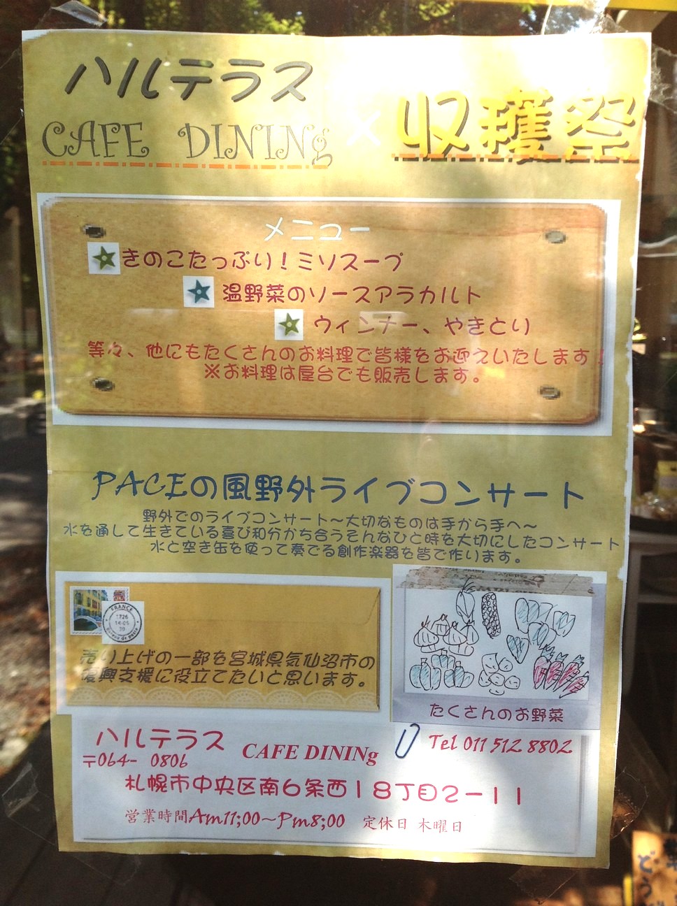 私へいはちも様々なイベントでお世話になっている円山にあるカフェ『ハルテラス』さんで、13日11時~「収穫祭と野外ライブ」を開催するそうです♪