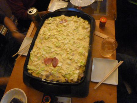 ホットプレートいっぱいに生地を敷き詰めたお好み焼きです。豪快だ。。。